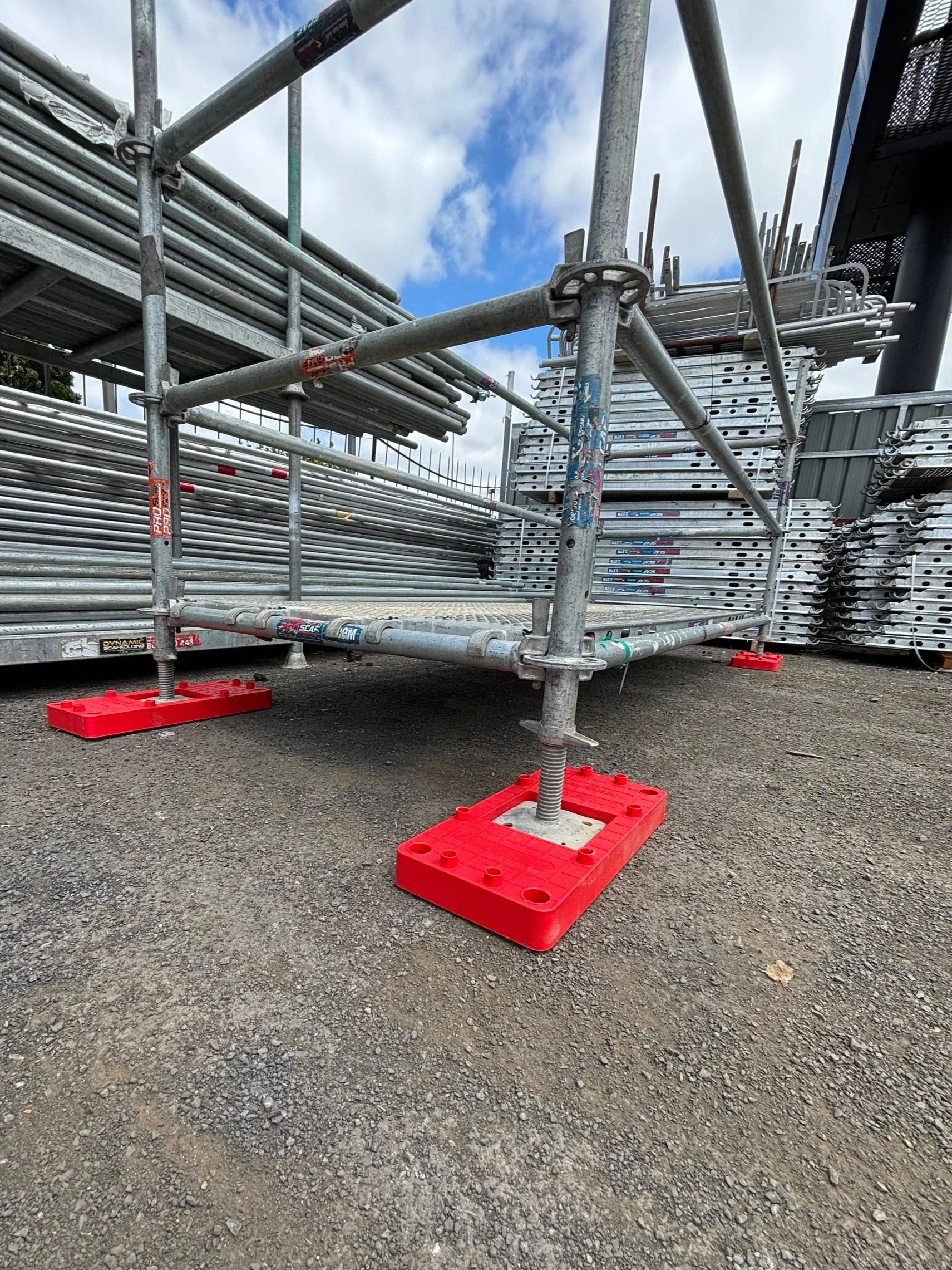 The interlocking design means multiple SafeSoul sole boards can be connected at right angles to safely support scaffolding even in uneven ground.